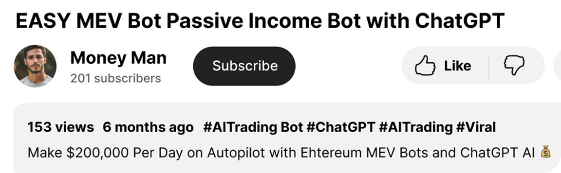 The YouTube video claims to offer easy passive income using a trading bot, which is a common theme in scams.